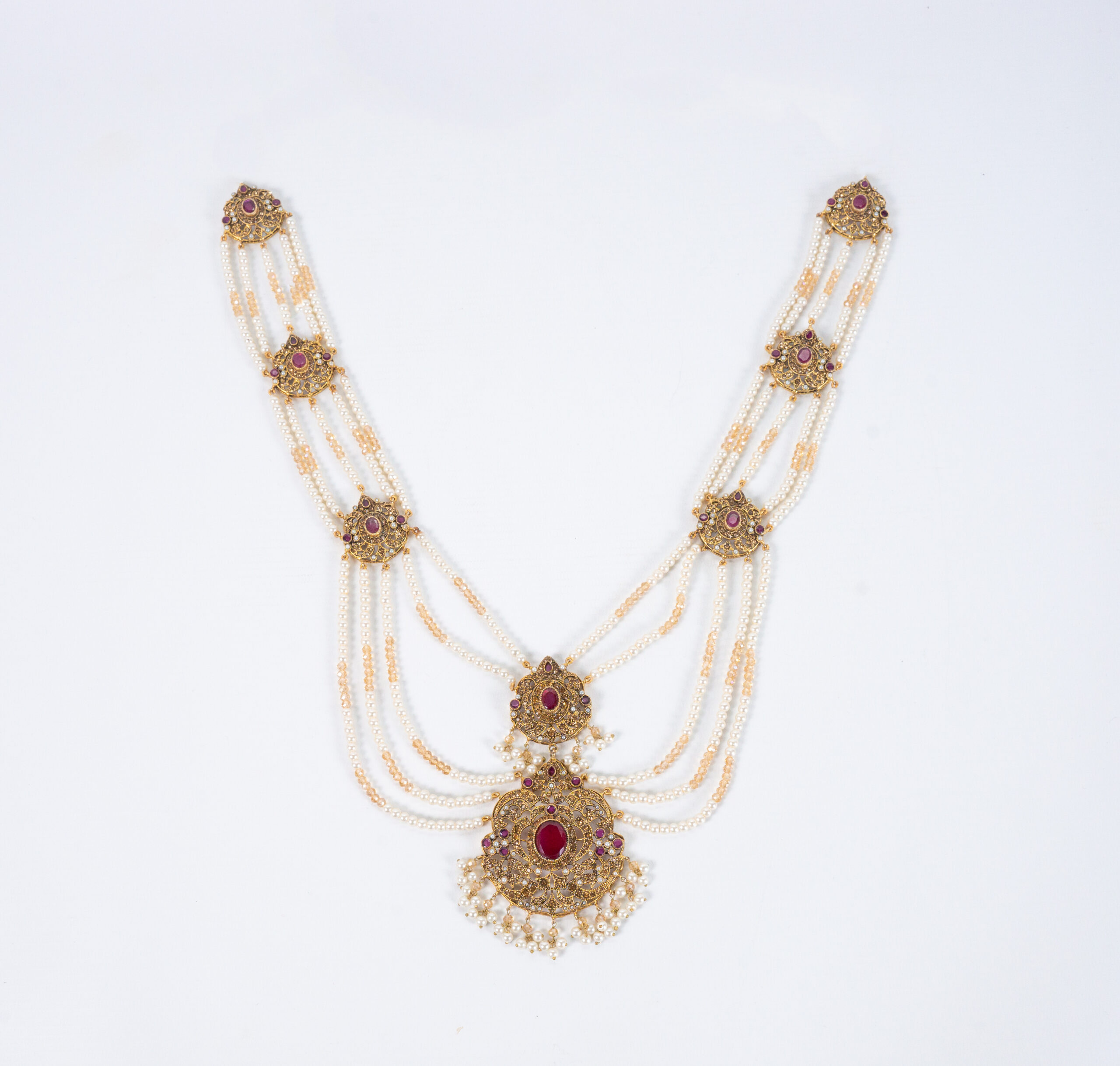 Image shows Ruby stones on an Antique Gold plating with Pearl/Champagne Beading