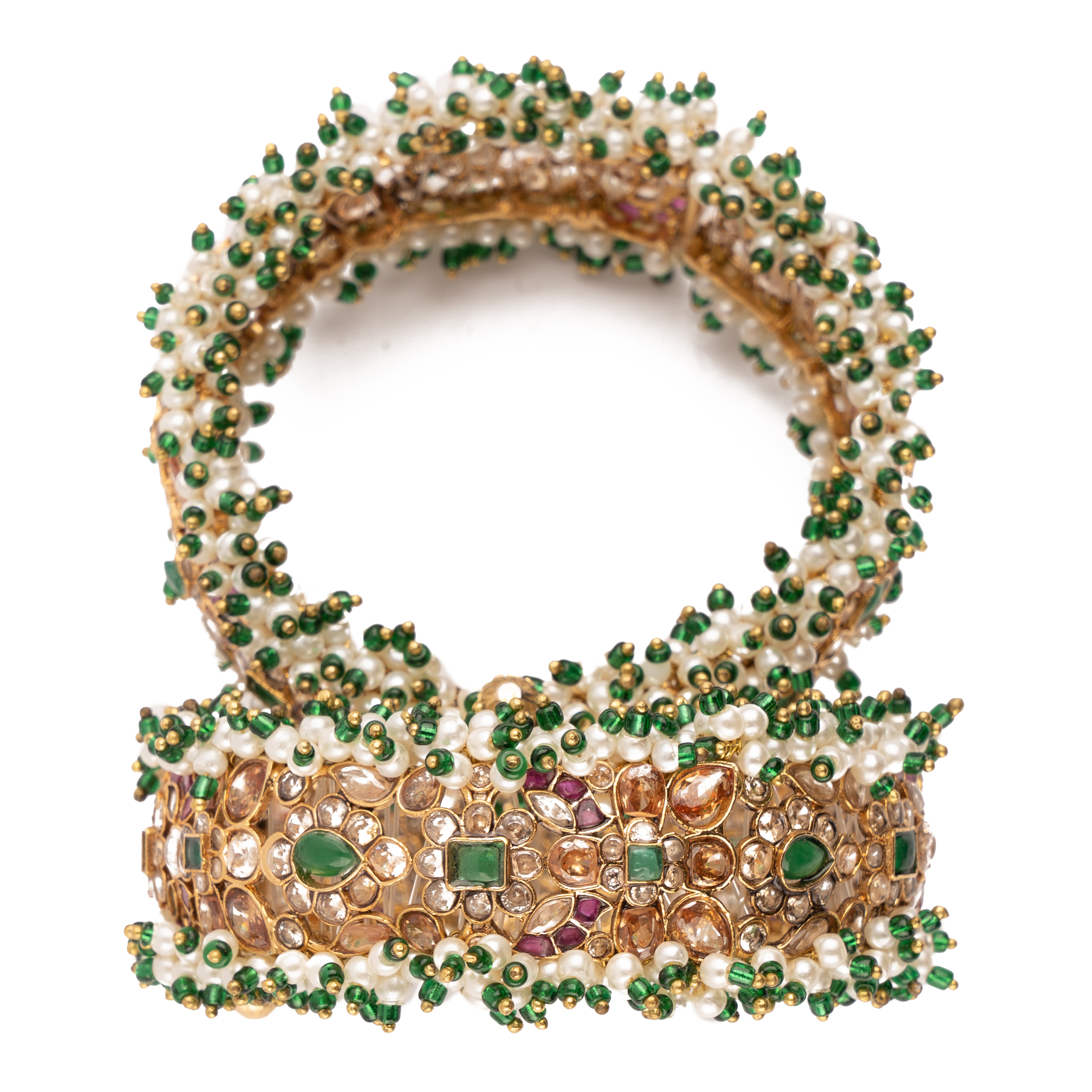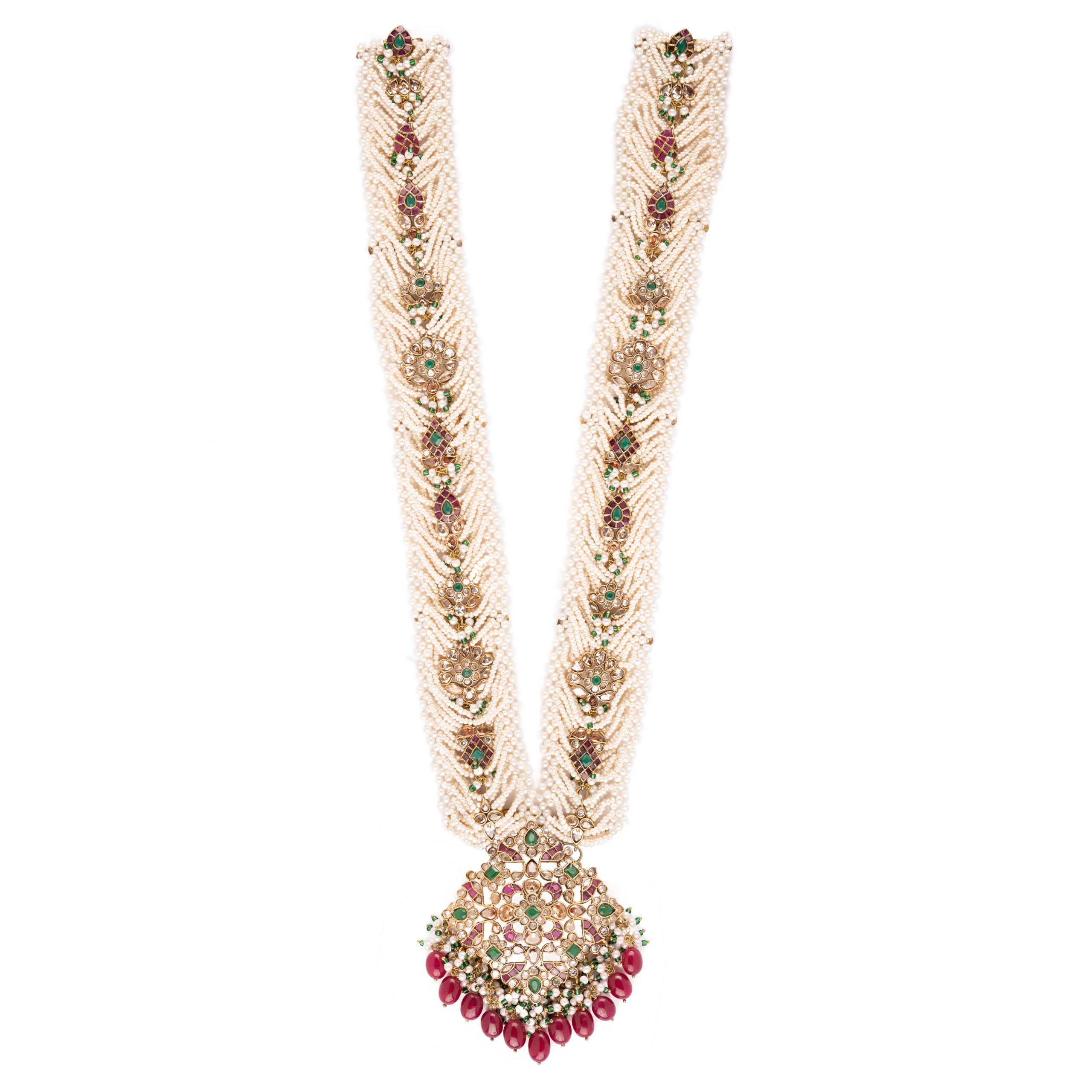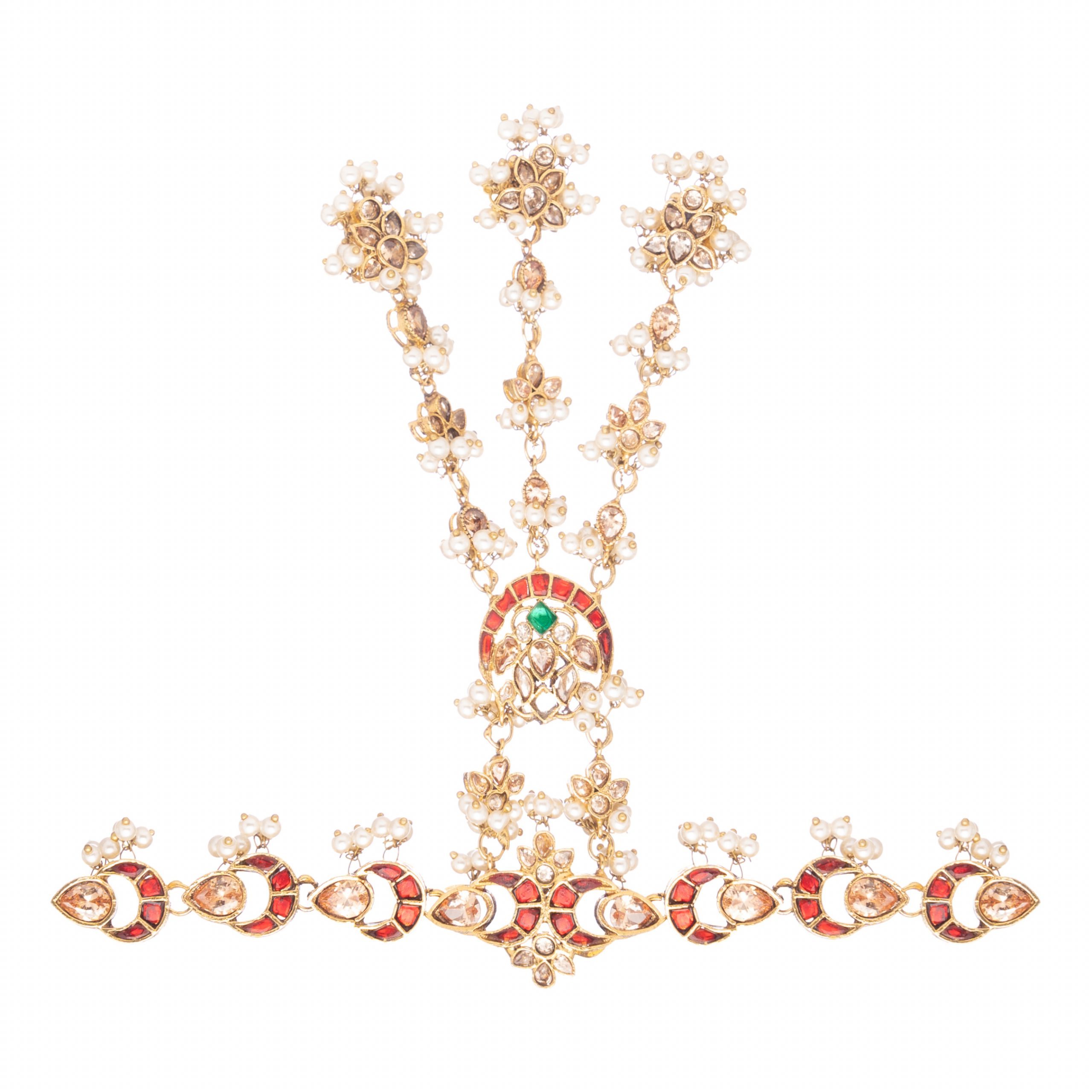 Timeless and unique luxurious pieces handcrafted with none other than real pearls on to a rich 22 carat gold plate. The pieces are embedded with uncut polki stone.. all created by JewelsnGems for timeless and traditional brides.