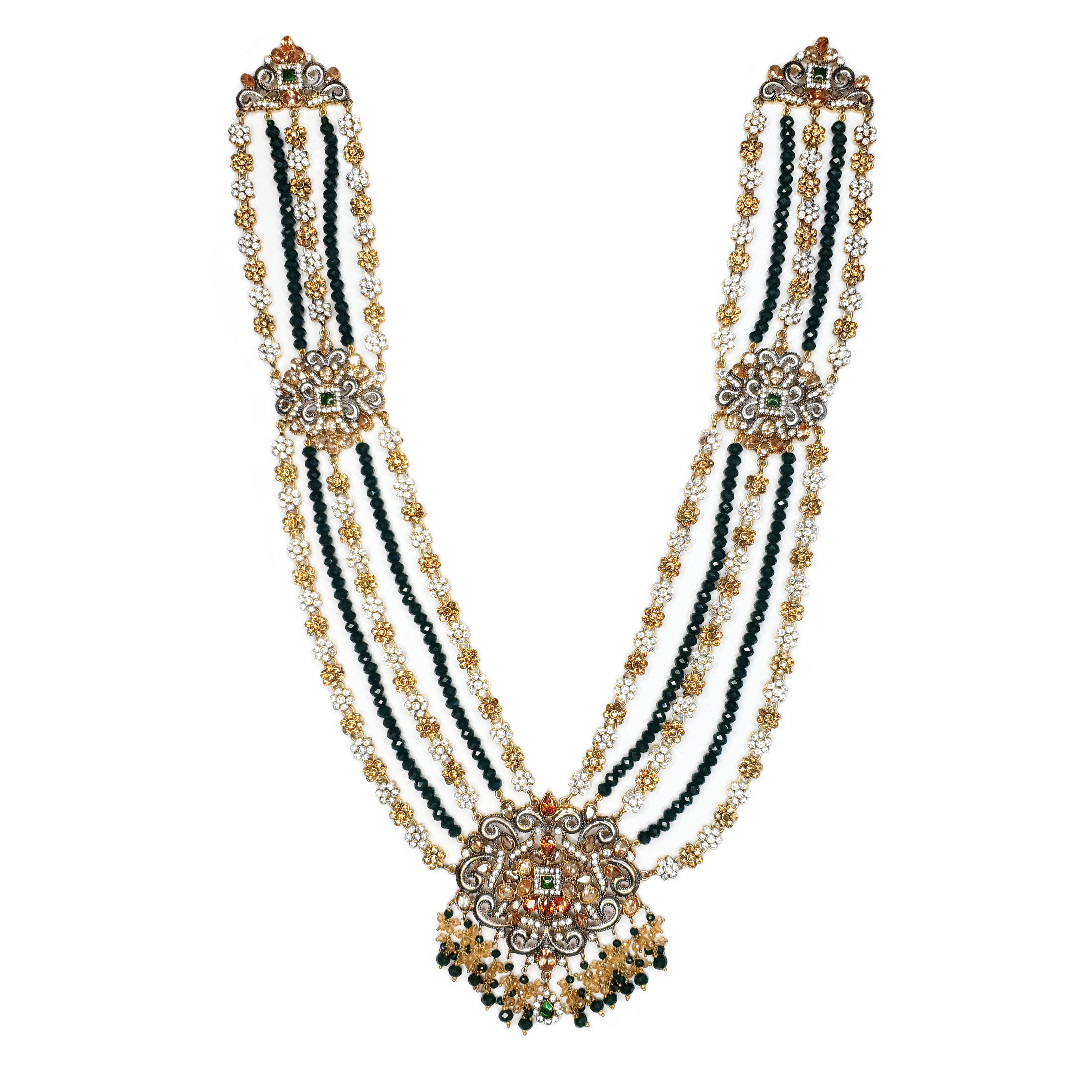 Luxury , ornate, handcrafted gold plated pieces with sterling silver intricate overlay work. Stones are real champagne polki with real zircons.