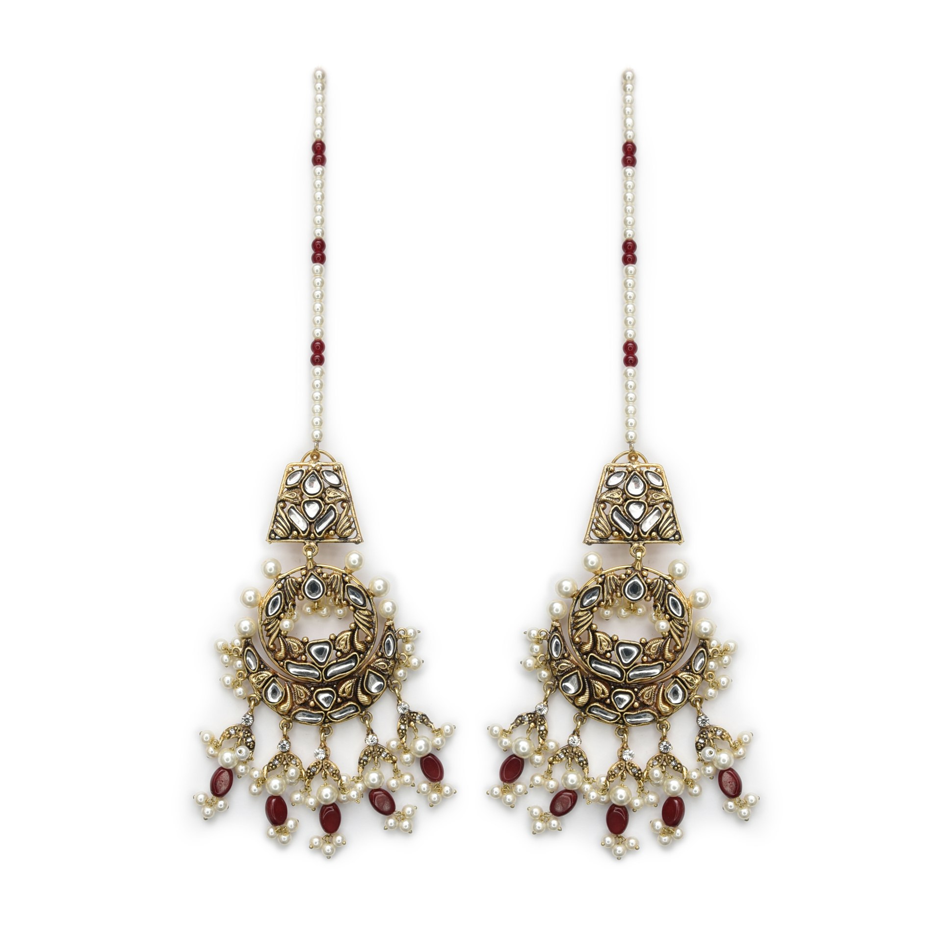 Intricate detailed oversize earrings shown with RUBY drop beading.