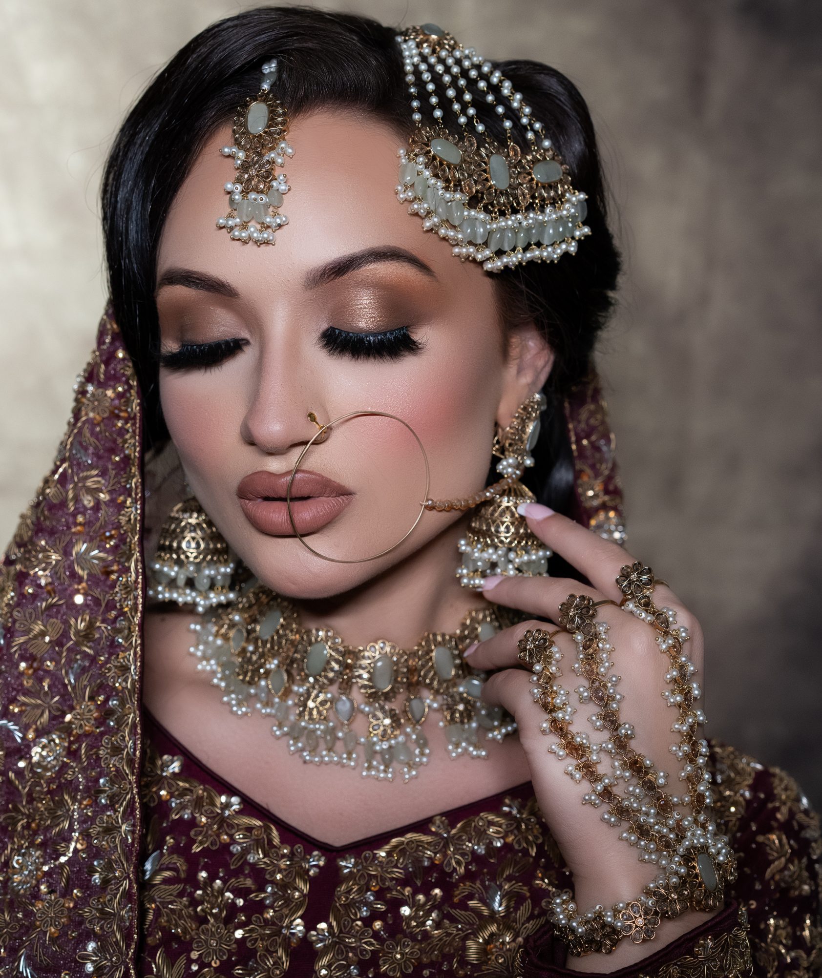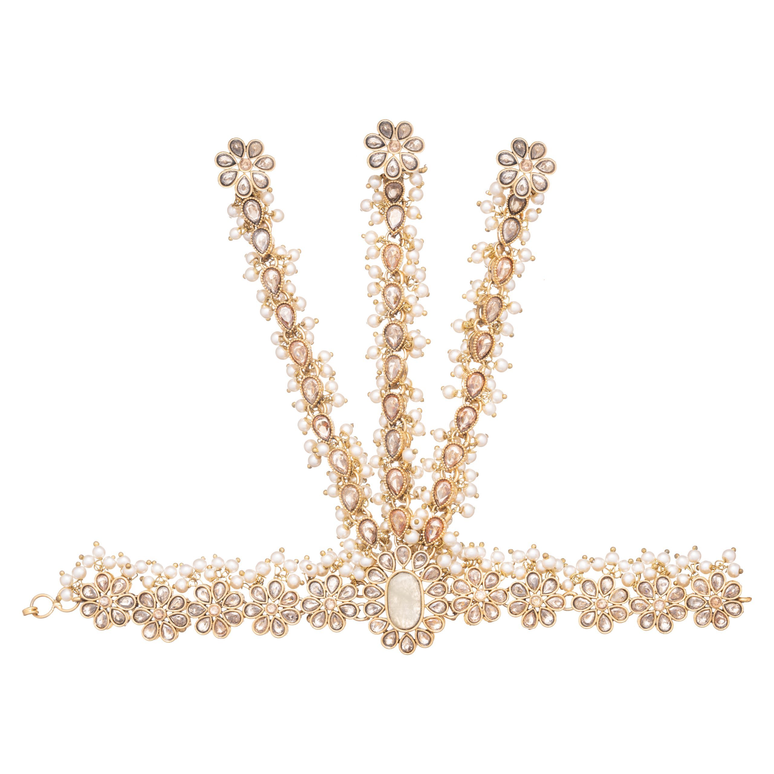 Dense plated full polki stoned design finished with real water fringing the finger & wrist chain.