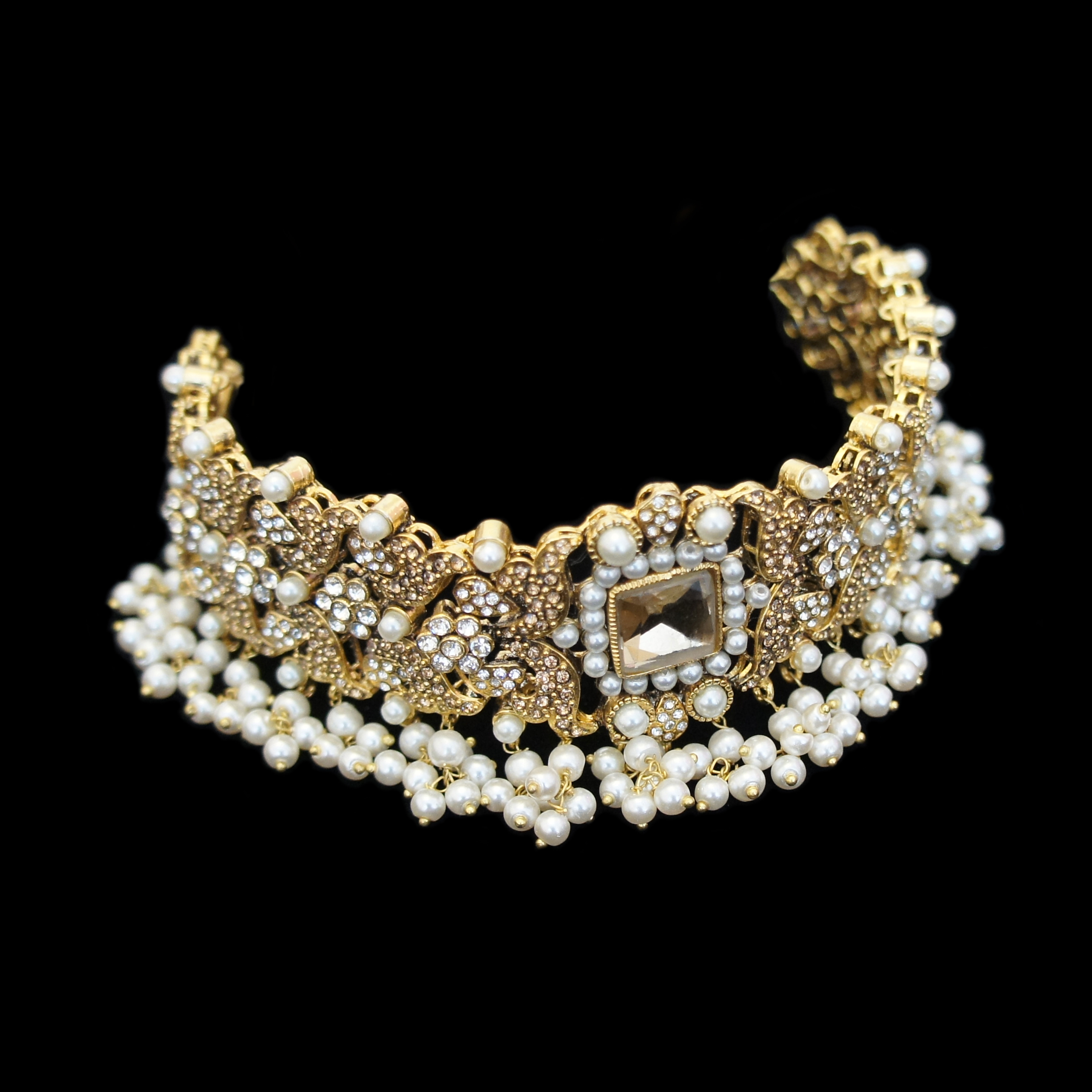 Nasheen Set is an intricate and contemporary design best contrasted to reception attires. Clawed with American Diamonds and Real Zircon , set with semi precious stones and fringed in Japanese beading this collection is breathtakingly beautiful. Highly recommended in Duck Egg stone on antique gold plating.