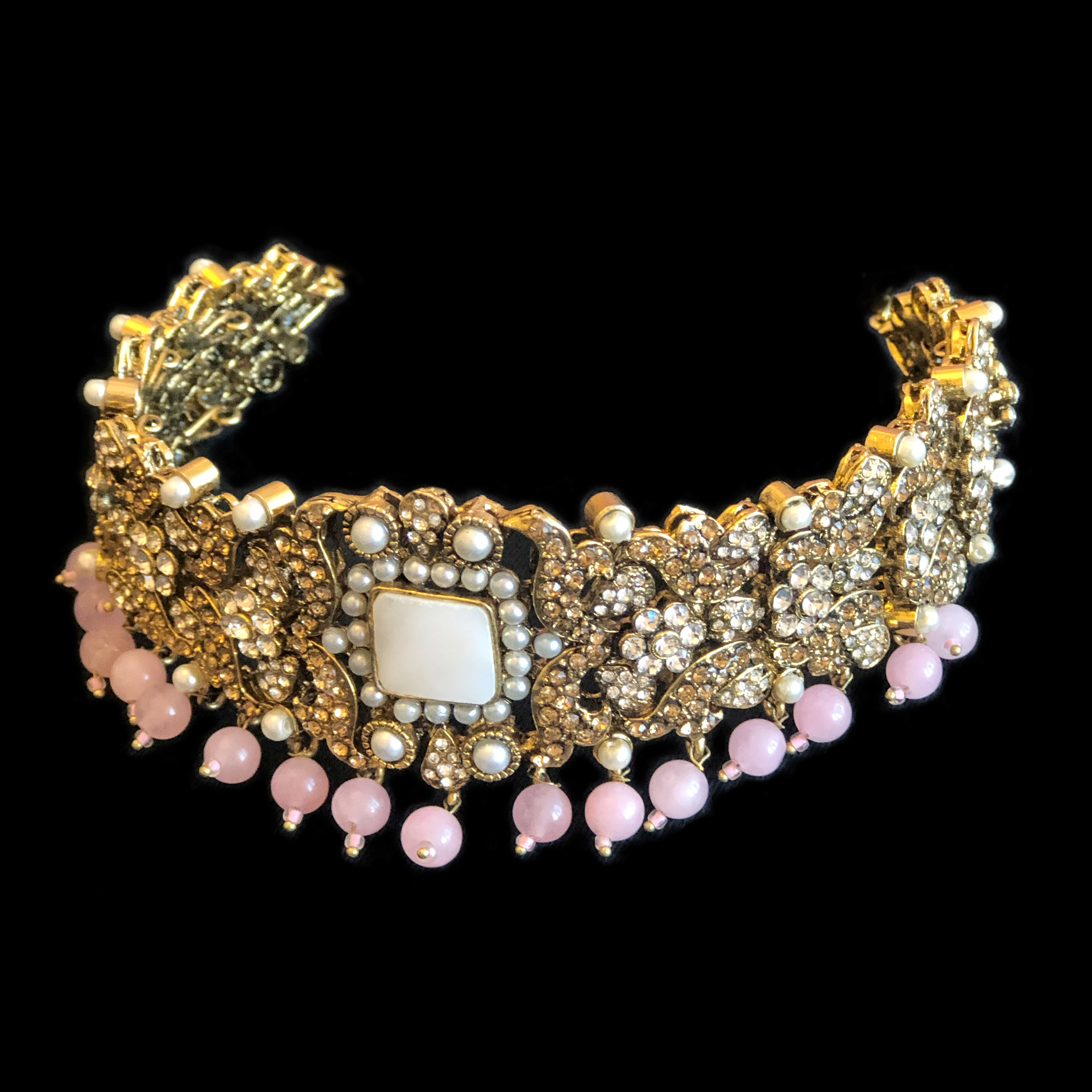 Model wears : ‘Opal white’ stone on an ‘antique gold’ plate with ‘blush’ large beads.