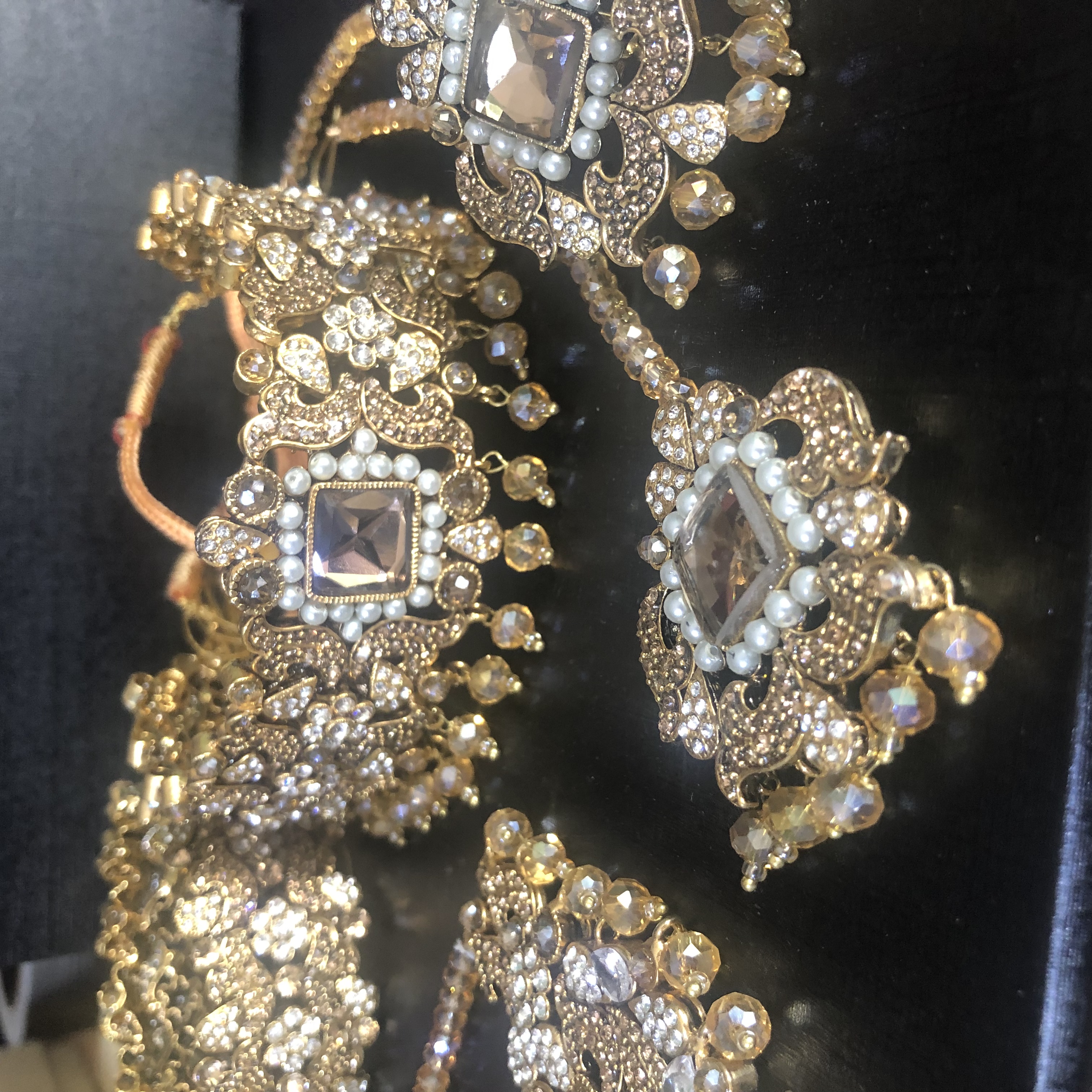 Nasheen Set is an intricate and contemporary design best contrasted to reception attires. Clawed with American Diamonds and Real Zircon , set with semi precious stones and fringed in Japanese beading this collection is breathtakingly beautiful. Highly recommended in Duck Egg stone on antique gold plating.
