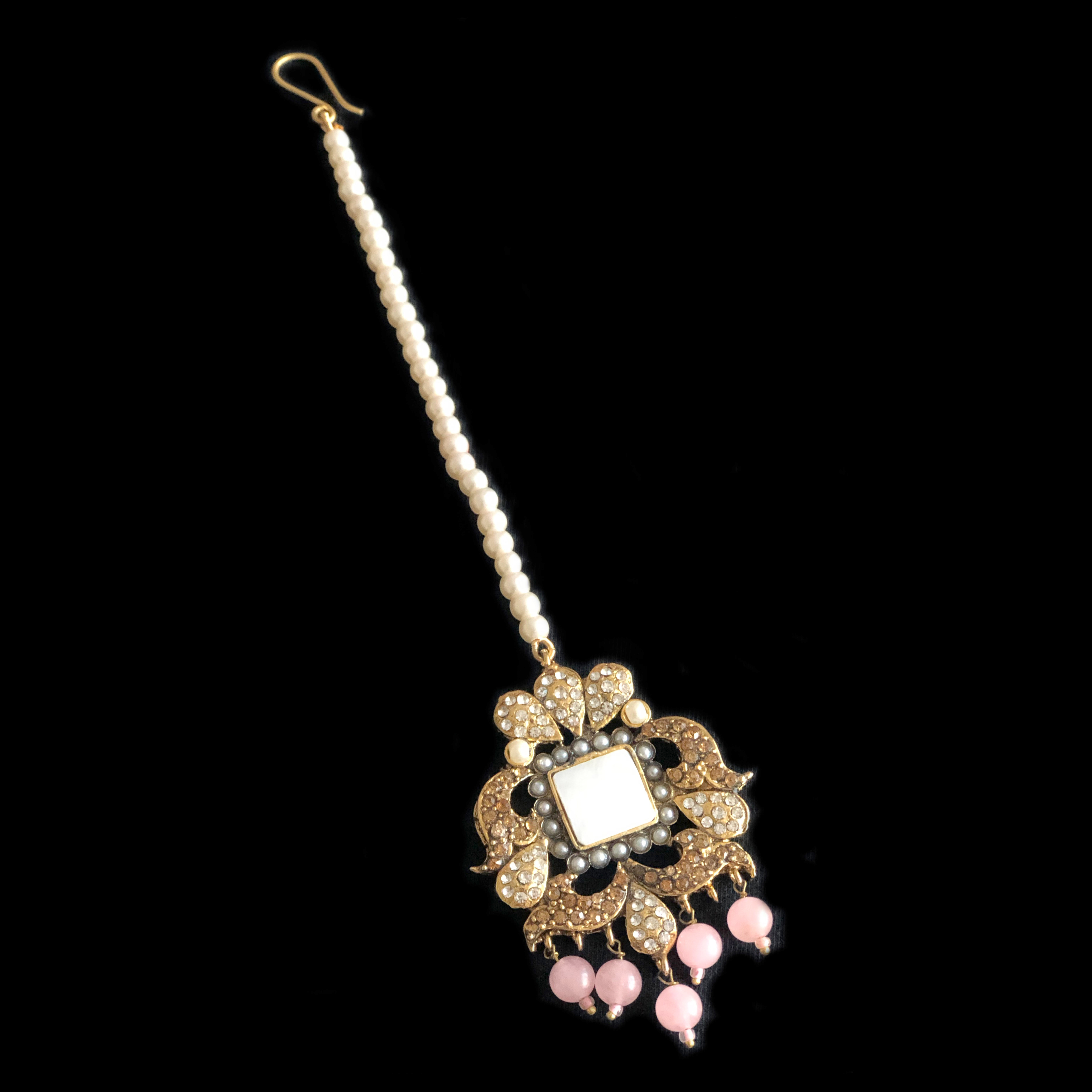 Image Shows: ‘Opal white’ stone on an ‘antique gold’ plate with ‘blush’ large beads.