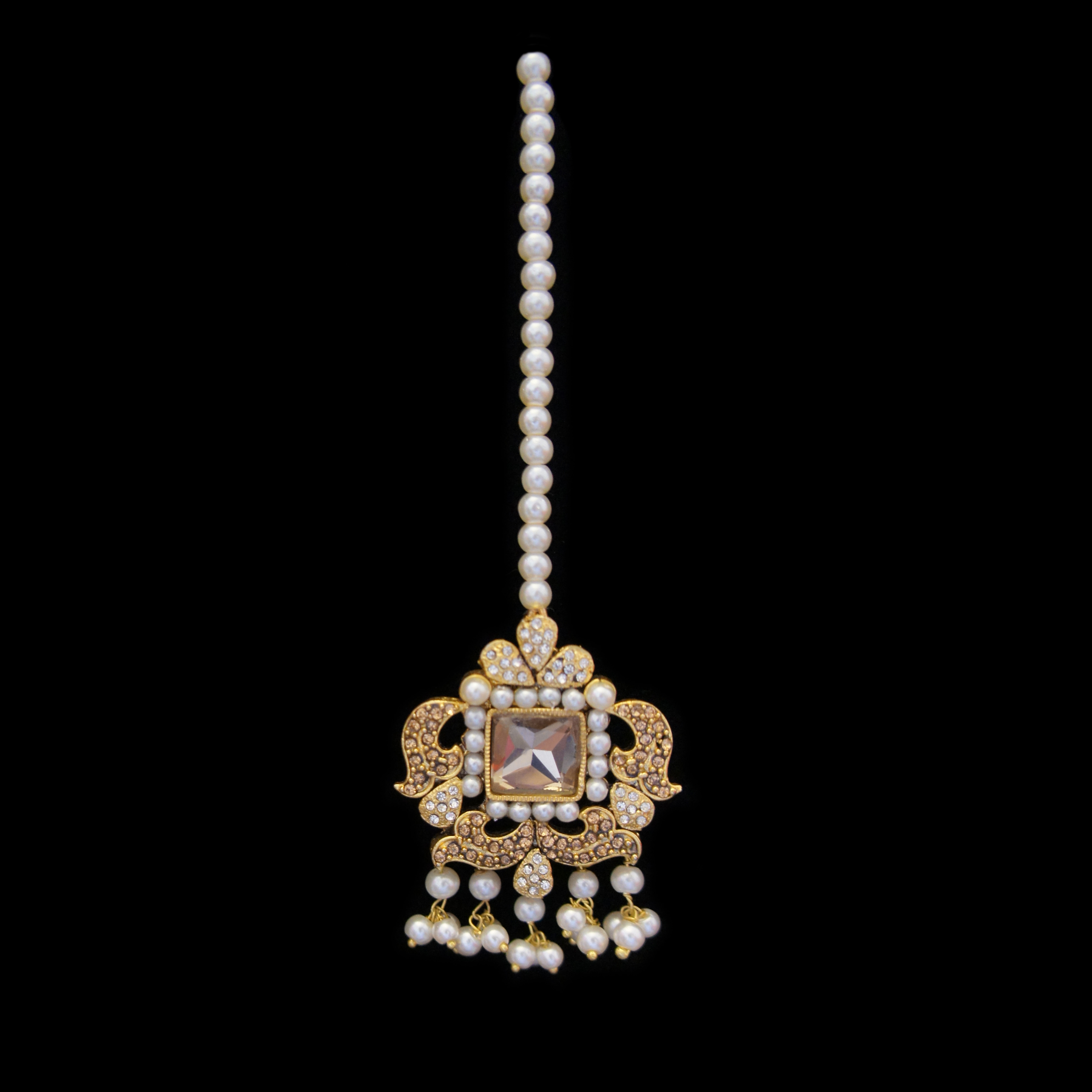 Nasheen Set is an intricate and contemporary design best contrasted to reception attires. Clawed with American Diamonds and Real Zircon , set with semi precious stones and fringed in Japanese beading this collection is breathtakingly beautiful. Highly recommended in Duck Egg stone on antique gold plating.