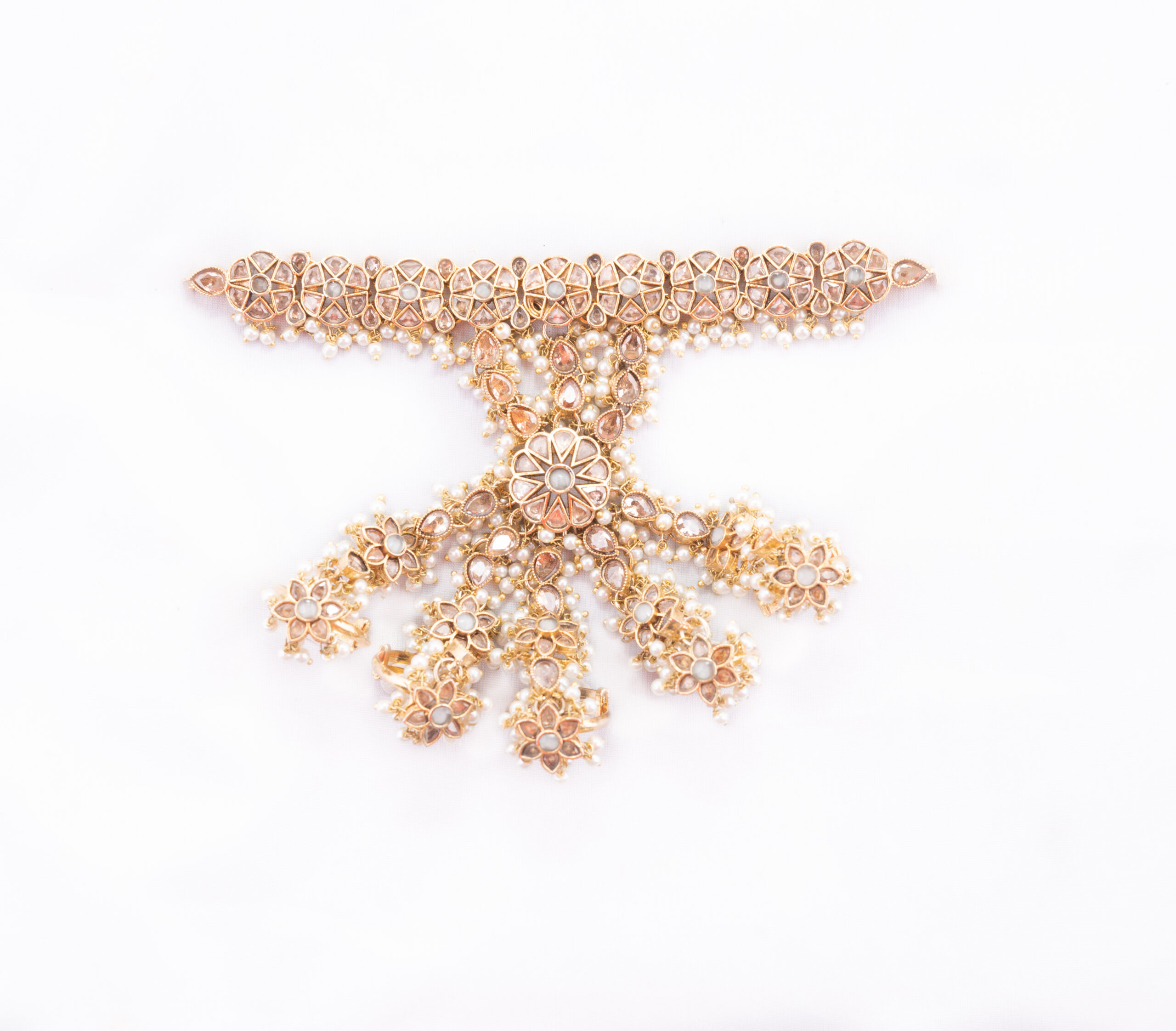 Handpiece is fully adjustable wrist chain and rings, comes standard with 5 rings. It is luxurious and regal with fringing of ivory pearls .