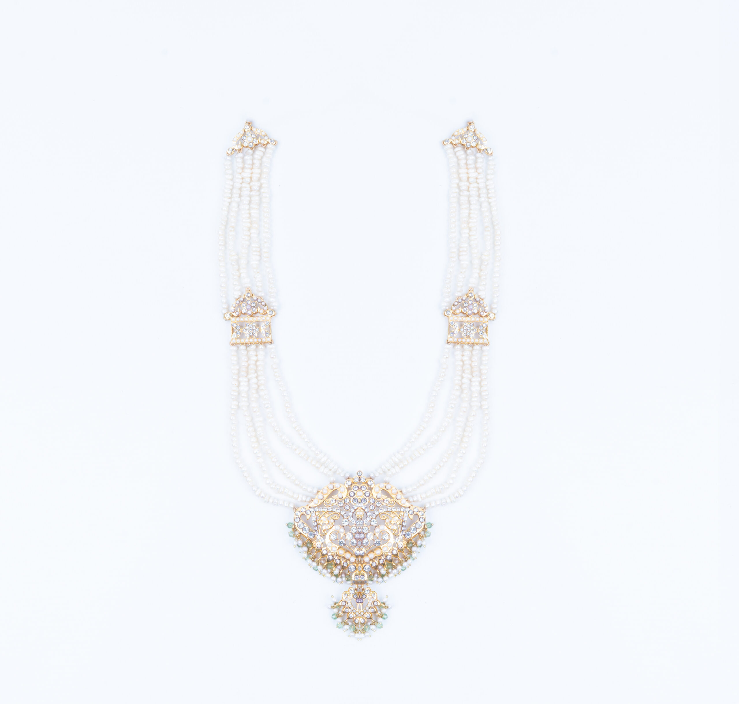 Rice pearl structured rani haar – weaved 10 rows of luxurious pearls with an intricate mid pendant – highly recommended for a regal bride who adores the elegance of real water rice pearls.
