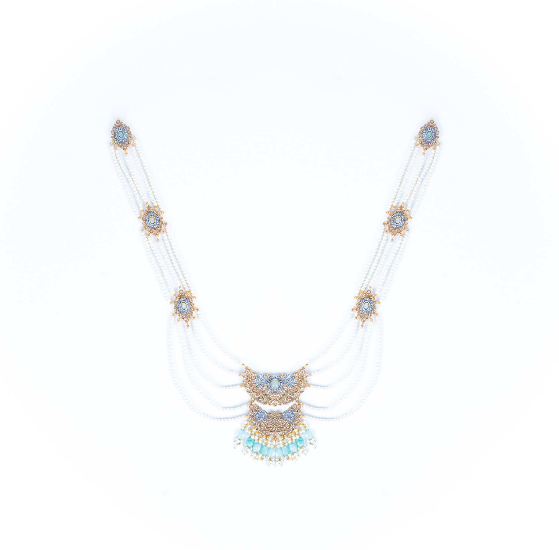 Clawed American Diamond set with real zirconia and polki stones finished in fringes of large Japanese rocks … perfect as individual pieces or an ensemble for brides.