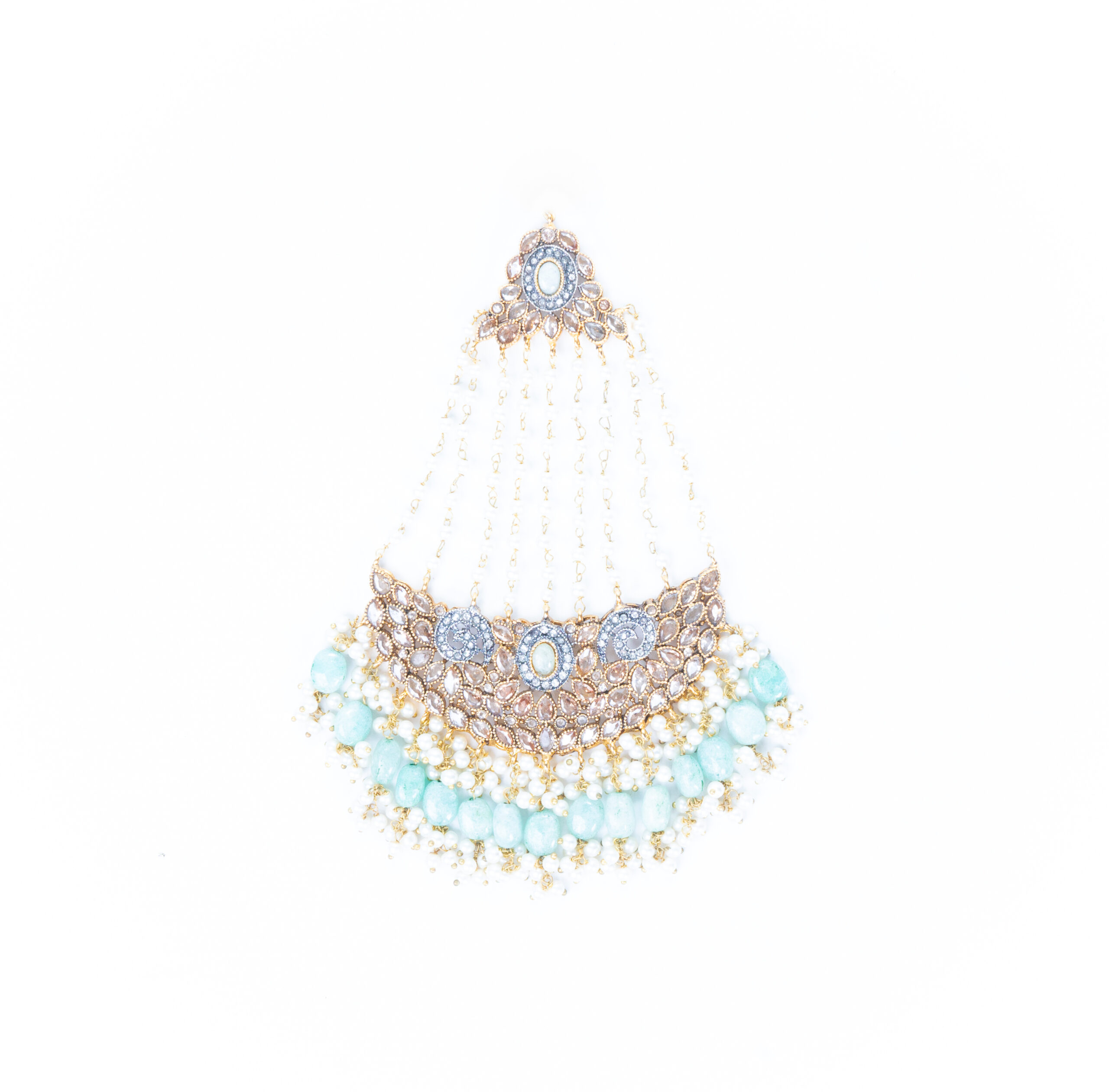 Set Includes: Tikka, jhummar, earrings, necklace, haar, nosepiece